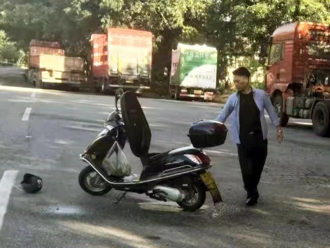 6月25日,机动大队辅警梁华仔途经港前大道与环市大道交汇口时,见前方一行驶中摩托车冒烟后起火,女车主不知所措。梁华仔立刻停车并利用车载灭火器帮助车主成功灭火。